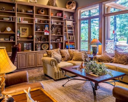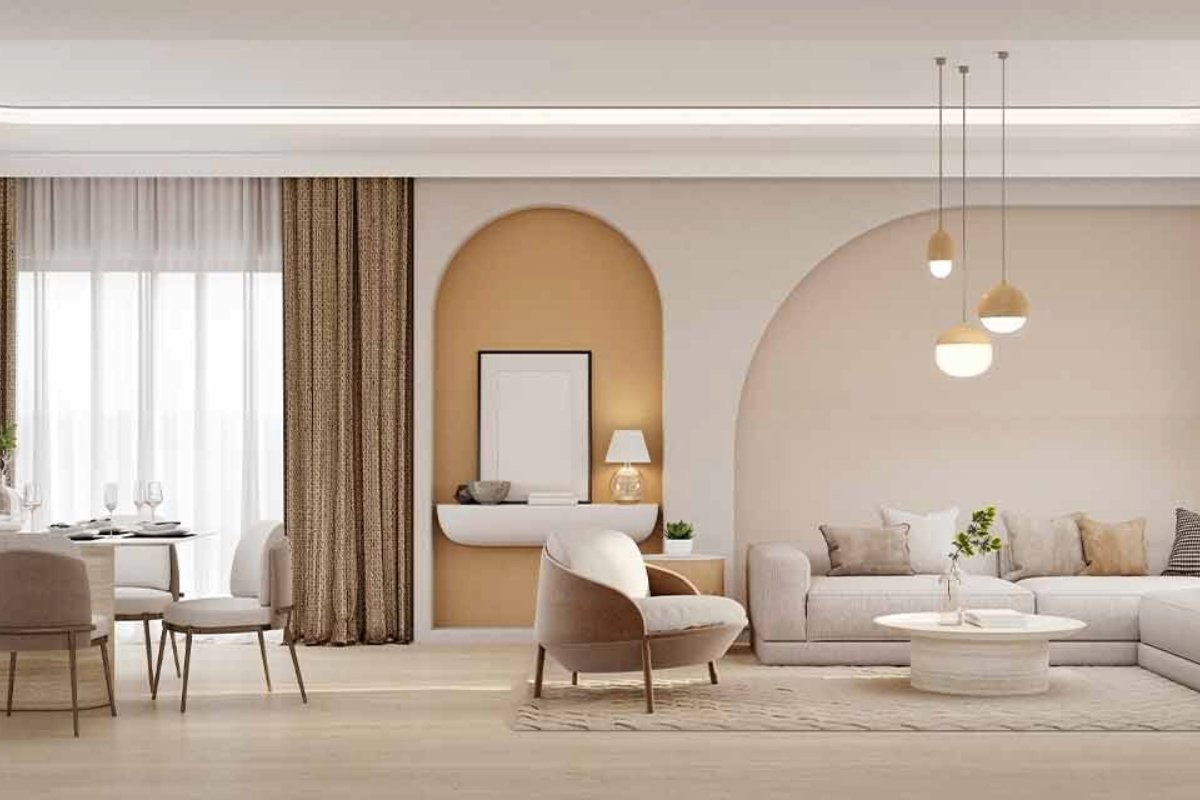 A living room with sleek, low-profile furniture, neutral tones, and a glass coffee table paired with large windows for natural light.